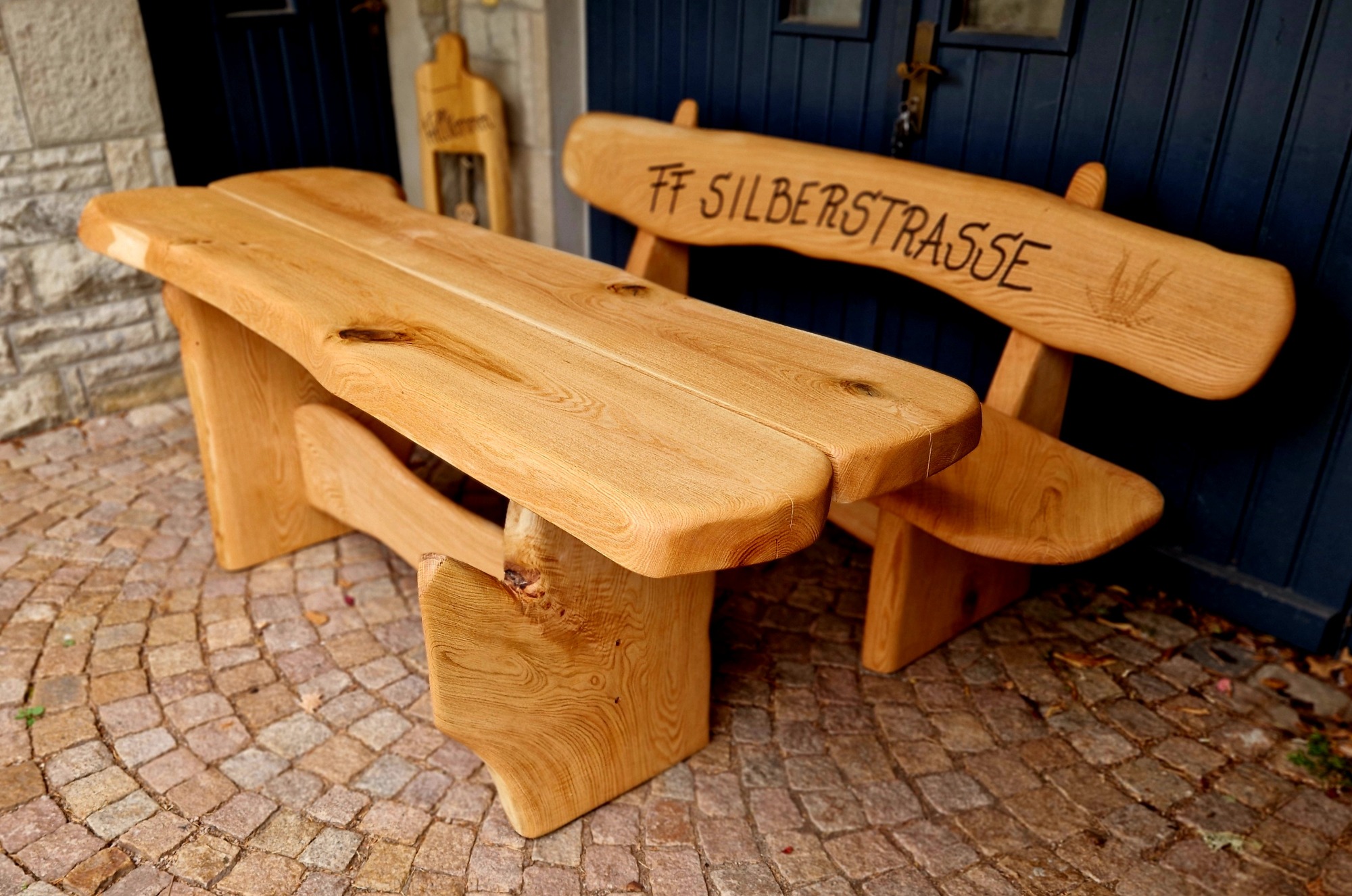 Roteiche Tisch 2,0 m x 0,6 m Bank 2,0 m mit Gravur